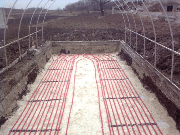 Le sol est chauffé avec un câble électrique spécial (par exemple, Agro verte), qui est renforcée par un treillis métallique et recouverte de plastique. Le câble est posé dans un coussin de sable recouvert d'un filet (profondeur de pose - 40 cm). Le chauffage est contrôlé à partir du panneau de commande du thermostat, l'électricité est coupée dès que la température atteint 25 ° C