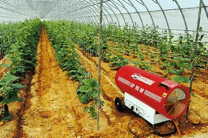 avantages chauffage avec un aérotherme: l'air chaud à l'aide d'un ventilateur lave uniformément le bâtiment à effet de serre, l'appareil fonctionne en mode automatique, ne produit pas d'émissions et de vapeurs nocives. L'appareil a un rendement élevé, chauffe rapidement l'air et les lits sur les étagères.