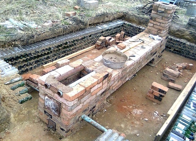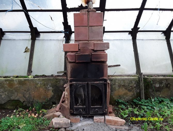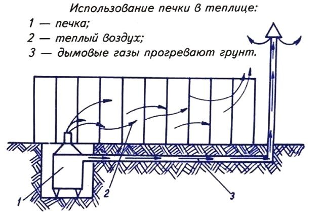 Sa structure est la suivante: une chambre de combustion en brique est aménagée dans le vestibule, et dans la serre, sur toute sa longueur, une cheminée est posée sous les étagères. C'est par elle que le monoxyde de carbone passe et quitte la pièce par le tuyau de l'autre côté.