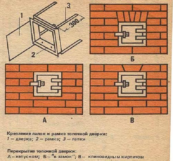 Fixation des pieds au cadre de la porte de combustion: 1 - porte; 2 - cadre; 3 - jambes. Chevauchement de la porte du four : A - chevauchement ; B - "dans le château"; B - brique en forme de coin
