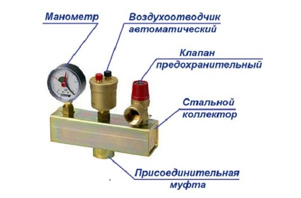 Étape 5. Installation d'un groupe de sécurité. Le groupe de sécurité se compose d'un manomètre, d'une soupape de sécurité et d'un purgeur d'air, qui sont situés sur un collecteur en acier équipé d'un accouplement pour la connexion au système. Branchez le groupe de sécurité immédiatement après la chaudière dans un endroit avec une température et une pression maximales.