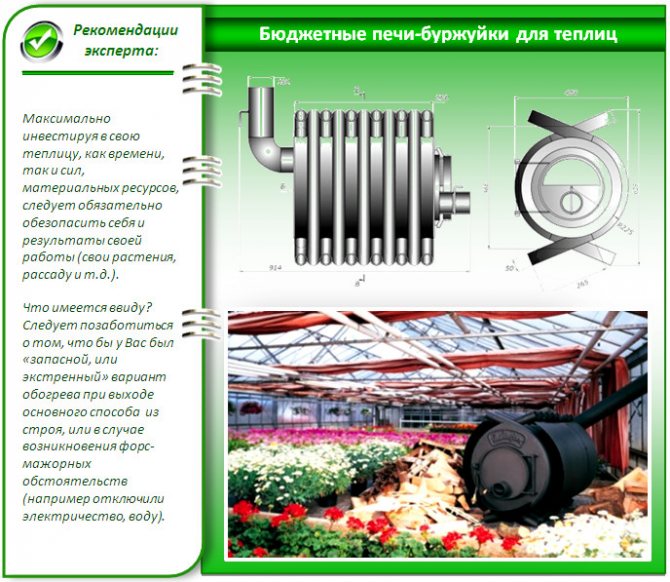 Il est recommandé d'utiliser des poêles en métal pour chauffer les serres pour une utilisation printemps-été, pour ce rôle, ils sont mieux adaptés que ceux en brique, en raison des caractéristiques suivantes: