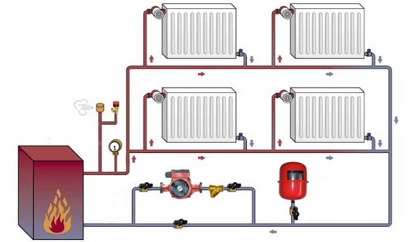 Pour les chaudières à combustible solide et les serres de grande capacité, il est également recommandé d'installer un accumulateur de chaleur. Le schéma de raccordement du circuit de chauffage est illustré sur la figure.