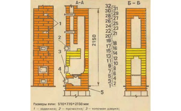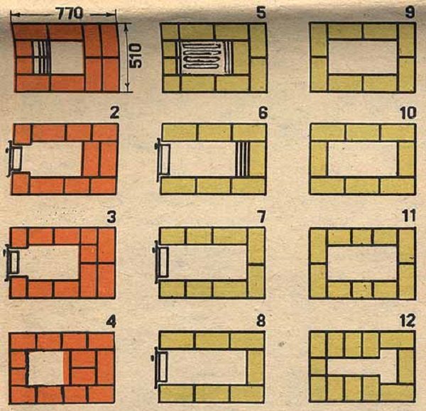 Les rangées 5 à 12 sont disposées en briques réfractaires sur un mortier réfractaire. Au 5ème rang, une grille est posée. Dans les 6, 7 et 8 rangées, une porte de combustion est installée. Les rangées 9 à 12 forment l'arche de la chambre de combustion.