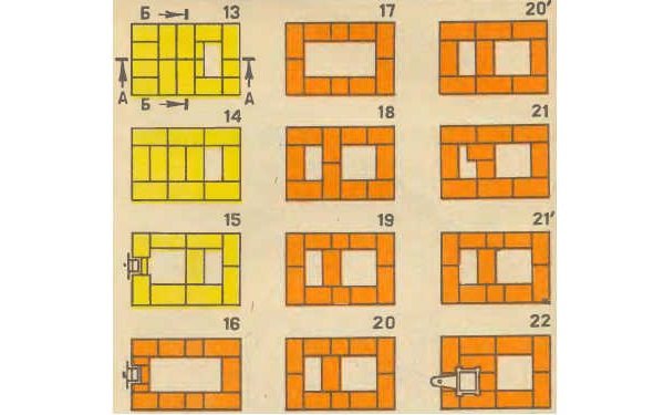 Étape 3. Les rangées 13 à 15 sont également posées à partir de briques en argile réfractaire sur un mortier réfractaire. Les rangées 13 et 14 chevauchent l'arche de la chambre de combustion, en 15, une porte de nettoyage est installée. À partir de la 16e rangée, la maçonnerie est à nouveau réalisée avec des briques rouges. Dans la 16e rangée, l'installation de la porte de nettoyage se poursuit. Les rangées 17 à 21 forment des canaux de fumée. Le premier volet de fumée est placé dans la 22e rangée.