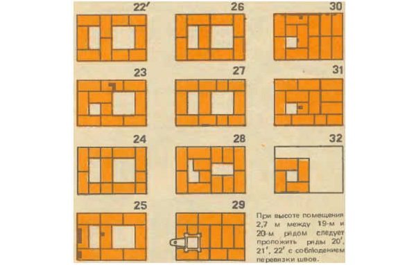 Étape 4. Les rangées 23 à 27 continuent les conduits de fumée. Dans la 28e rangée, le rétrécissement du canal est aménagé, dans la 29e, le deuxième volet de fumée est installé. Les rangées 30 et 31 forment le toit du four. À partir de la rangée 32, une cheminée de la hauteur requise est composée de 4 briques avec un bandage.