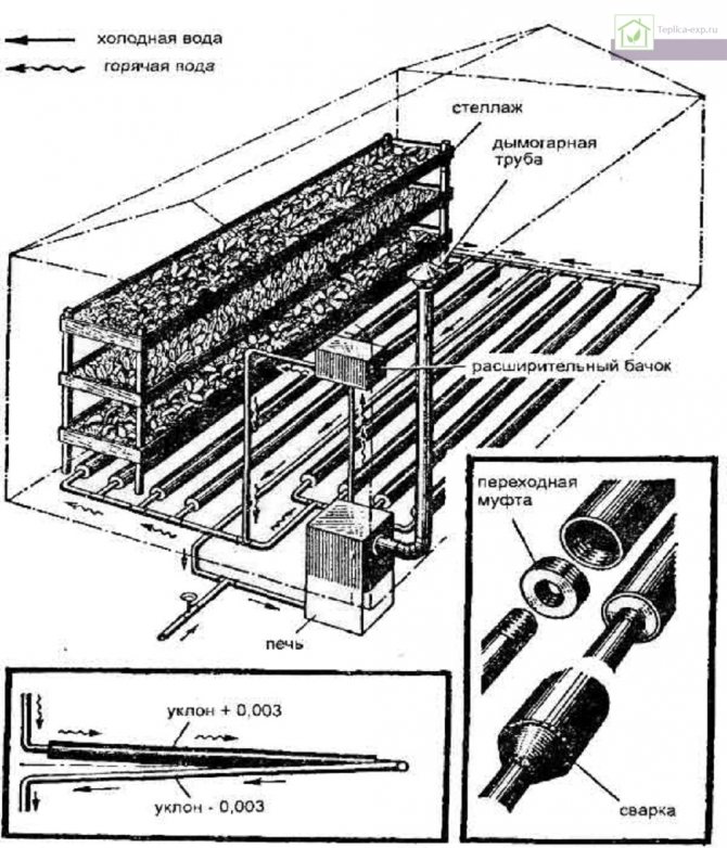Le chauffage de l'eau dans une serre peut se faire de deux manières: en connectant la serre au système de chauffage de la maison ou en installant une chaudière séparée. Le raccordement au système général est effectué dans un circuit séparé afin qu'il puisse être déconnecté et l'eau drainée.