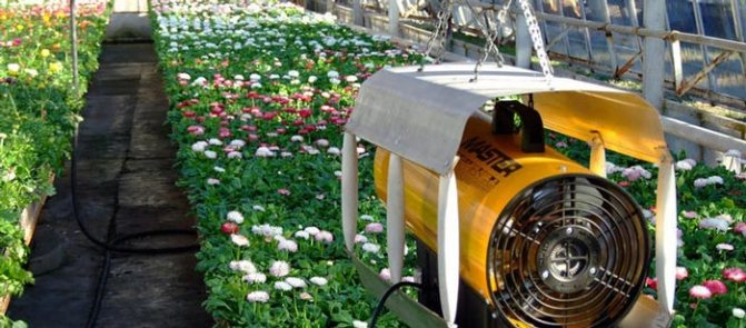 Pour le chauffage des serres, des canons à combustible liquide sont applicables, ainsi que des canons à gaz. Grâce au chauffage indirect, il est de bon ton d'évacuer les gaz des serres et d'assurer un microclimat bon et chaud dans la serre. Des canons à gaz à chauffage direct sont également utilisés, l'utilisation de canons électriques est coûteuse et déconseillée.