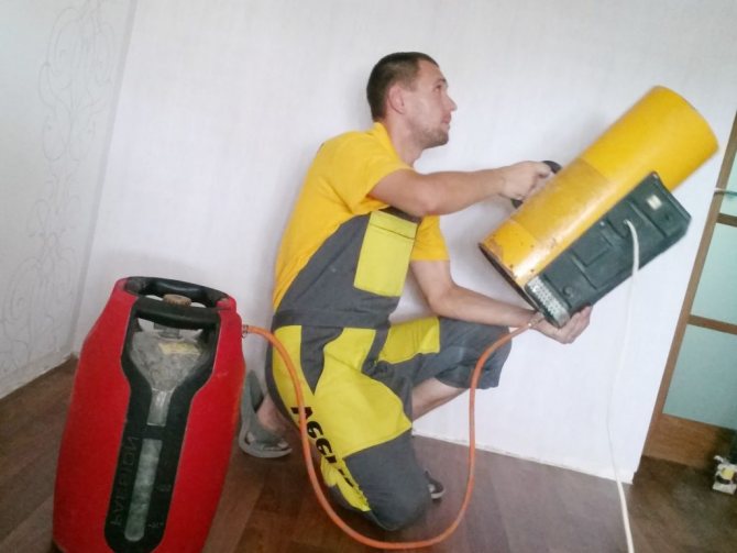 - Kirill. Un canon à gaz a été pris pour chauffer les locaux avec chauffage direct. Le choix d'une telle variation doit être pris avec beaucoup de soin, car les produits de désintégration sortent après la combustion.