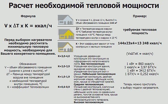 - isolation thermique de la pièce joue un rôle important. Un facteur spécial est pris en compte lors du calcul de la puissance du pistolet. Si tous les murs, le sol et le toit sont isolés, le nombre de fenêtres est petit, elles ont des cadres doubles, alors k = 0,6-1. Si les murs sont en briques, mais sans isolation, le toit est standard et le nombre de fenêtres est moyen, alors k = 1-2. Pour les structures avec un seul mur de briques, des cadres de fenêtre simples (garages, par exemple), le coefficient k = 2-3 est utilisé. Pour les zones ouvertes et semi-ouvertes, les structures en bois et en métal simplifiées sans isolation thermique, k = 3-4. Disons que nous avons un garage avec des murs en briques doubles sans isolation thermique, qui sera plus ou moins souvent visité par les visiteurs, alors nous supposerons que k = 1,8;