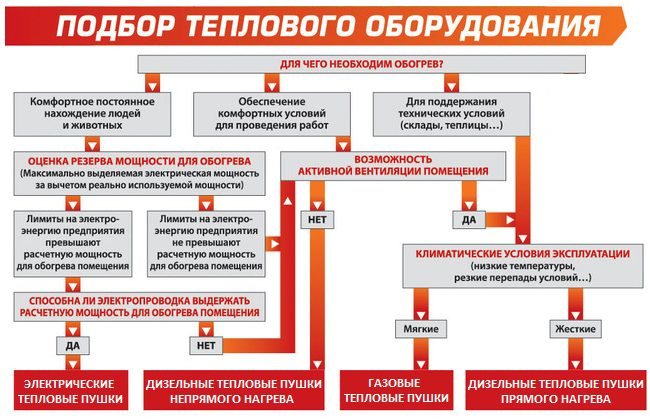 Les pistolets thermiques électriques, malgré leur facilité d'utilisation, ne sont pas pratiques à utiliser dans de tels bâtiments, car, compte tenu du coût élevé de l'électricité, chauffer une pièce de grand volume équivaut à allumer une cuisinière avec des billets de banque. Pour chauffer des pièces fermées d'un volume de plus de 300 mètres cubes, la meilleure option serait d'utiliser des canons à gaz et diesel à chauffage indirect.
