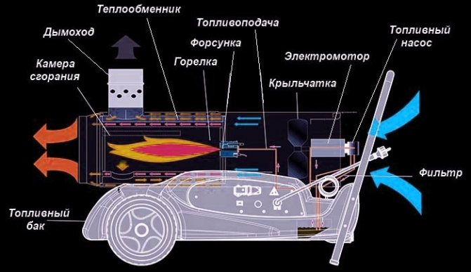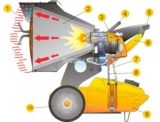 A l'intérieur du corps se trouve un élément chauffant (élément chauffant électrique / spirale ou chambre de combustion avec échangeur de chaleur) et un puissant ventilateur électrique. Le ventilateur souffle de l'air froid à travers les trous du boîtier à l'intérieur du pistolet, l'entraîne le long de l'élément chauffant et aide à distribuer l'air déjà chaud dans toute la pièce. Ainsi, un pistolet thermique est intrinsèquement un radiateur soufflant puissant.