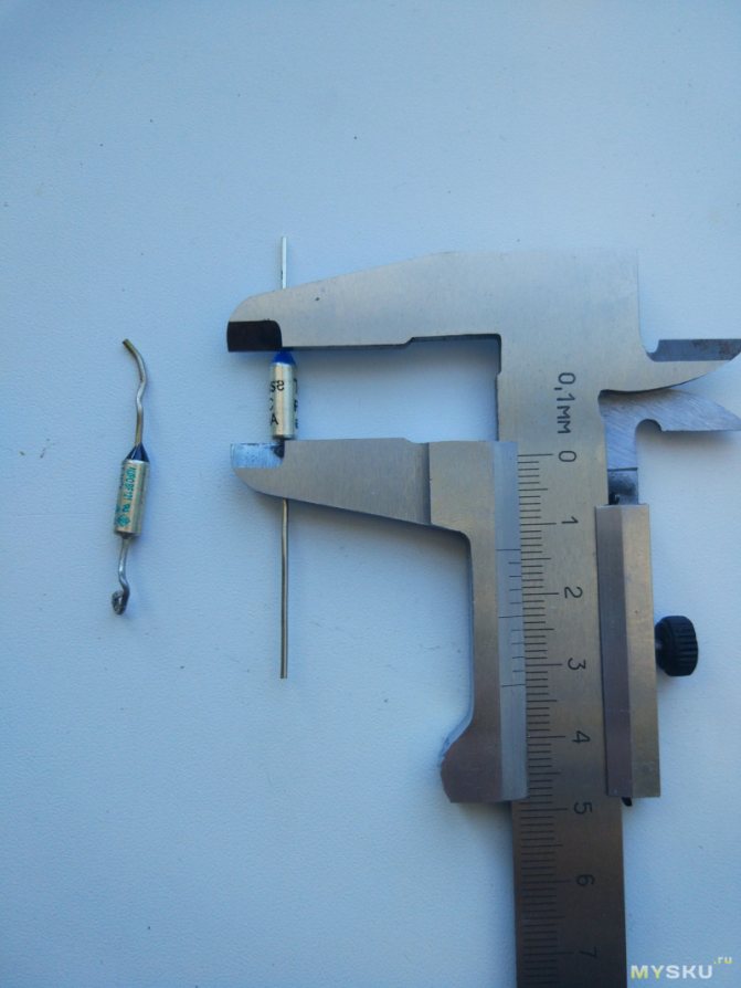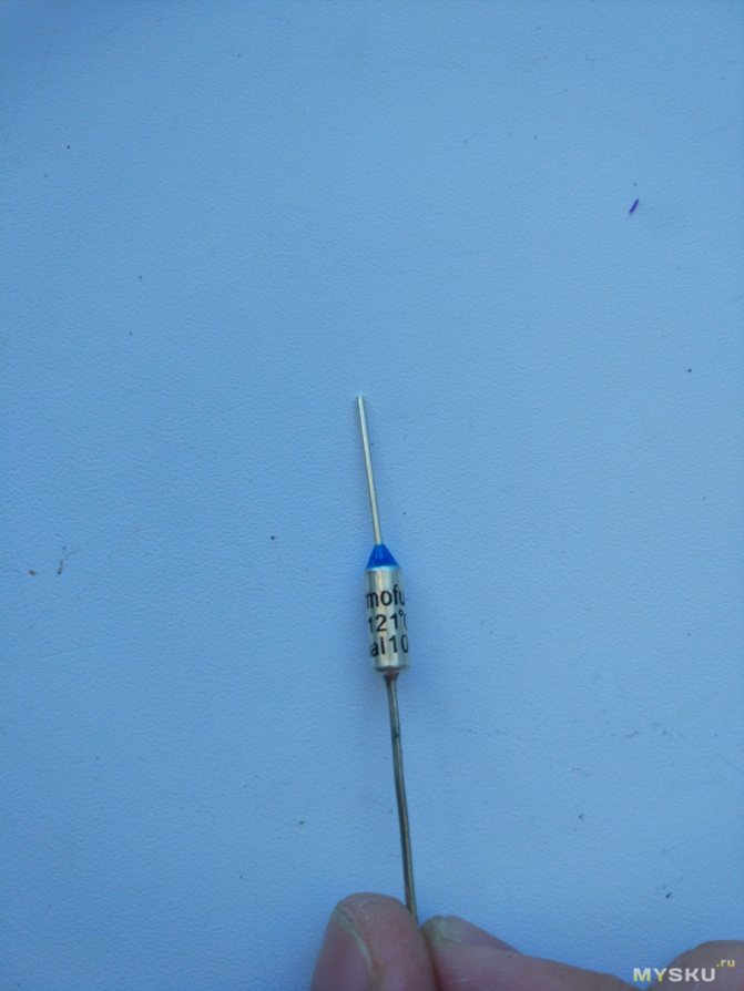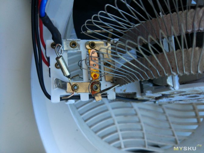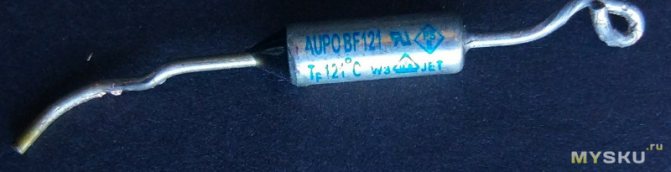 - Il y a un fusible thermique non loin de l'élément chauffant. L'appareil ne permettra pas qu'un incendie se produise, si soudainement de l'huile s'échappe, le relais de température se brise. Le réchauffeur d'huile fonctionnait dur lorsque l'élément chauffant en cuivre commençait à fondre. De l'huile fuira - une température élevée à travers le boîtier déclenchera le fusible thermique collé. La structure distingue le bimétallique (réutilisable) ou le fil (jetable). La photo montre la présence d'une tablette clairement noircissante au-dessus de l'élément chauffant: un fusible thermique (voir la première photo de la revue), ou un relais thermique (déterminé par le design).