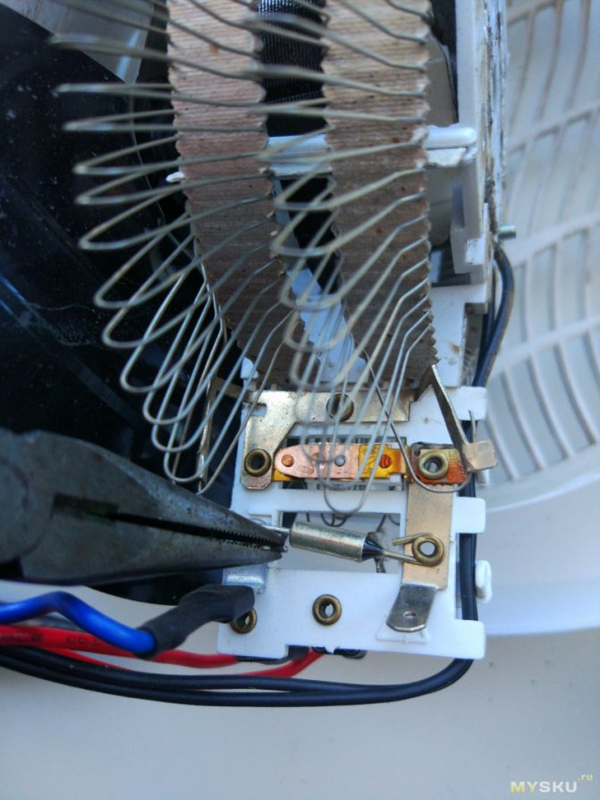 ... Parfois, une ampoule est ajoutée à la clé, l'éclairant lorsque l'appareil est allumé. Une complication supplémentaire de la réparation dans ce cas est de faire sonner les contacts de l'interrupteur en position marche avec le testeur. L'appareil doit afficher des unités d'Ohm ou de zéro, s'il montre un circuit ouvert ou des centaines d'Ohm ou plus - l'élément doit être remplacé. Si le chauffage est vital, l'interrupteur est exclu du circuit d'alimentation en connectant les fils solidement ensemble. Mais avec le temps, il est préférable de le remplacer, car dans ce cas, les contacts de la prise et de la fiche brûleront inévitablement lorsque l'appareil est allumé.
