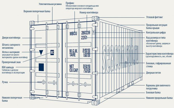 Le conteneur est équipé de portes battantes hermétiquement scellées avec des poignées qui s'ouvrent avec des mécanismes de verrouillage. Sur les portes extérieures sont marquées des symboles: poids, volume, capacité de charge et autres. Si les étiquettes manquent, le conteneur a été repeint. Il peut y avoir de la rouille sous la peinture.