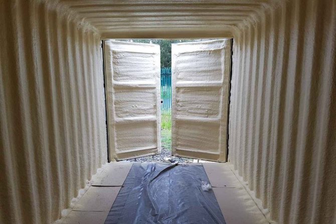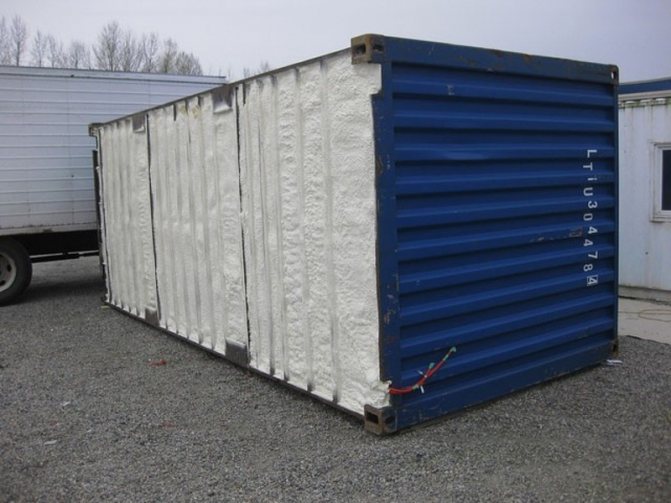 Une couche de mousse de 5 cm en termes d'isolation thermique entre en concurrence avec un mur de briques de 1,5 mètre d'épaisseur. Avec une telle isolation, l'effet d'un thermos est créé - la chaleur ne quitte pas la pièce et un appareil de chauffage peut chauffer les pièces en 30 à 40 minutes. Vous pouvez également isoler le conteneur avec une couche de laine minérale de 12 cm.