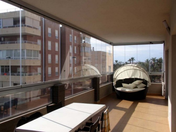 Pour une telle loggia, il est permis d'utiliser du linoléum comme revêtement de sol. En raison des fenêtres à double vitrage et de l'isolation fiable de la pièce, le matériau ne sera pas soumis à des changements brusques de température. En outre, la doublure ou le stratifié convient à la décoration.