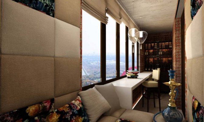 Si l'appartement dispose d'une loggia, elle peut également être utilisée à cet effet. Des fenêtres panoramiques, une belle vue et des fauteuils moelleux rendront votre séjour aussi confortable que possible. Vous pouvez utiliser des chaises en osier, une table assortie et beaucoup de verdure, combinant votre narguilé à la maison avec un espace pour boire du thé.
