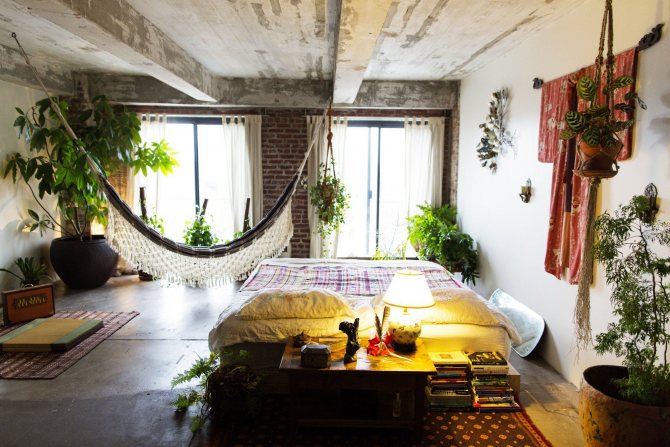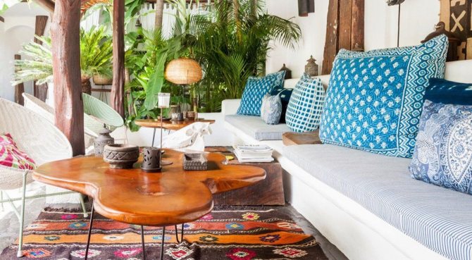 Souvent, un coin salon compact est installé ici - une table avec des chaises ou un petit fauteuil complètent l'espace avec de la verdure. Cette solution a fière allure dans un style campagnard, en Provence ou en combinaison avec un style écologique. Il convient également d'envisager l'option du style scandinave ou oriental.