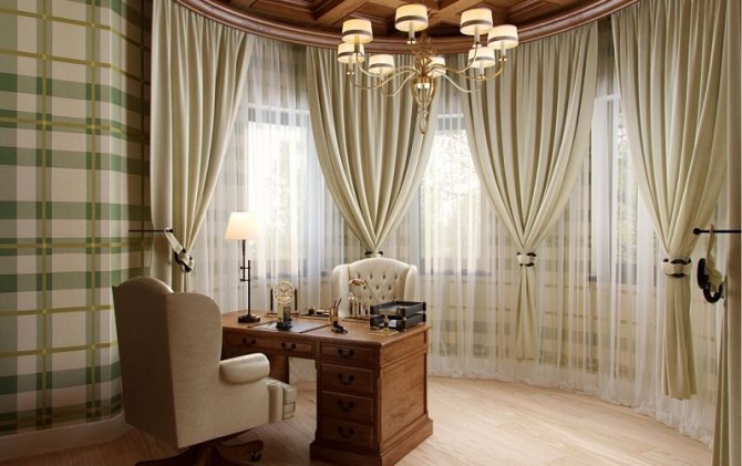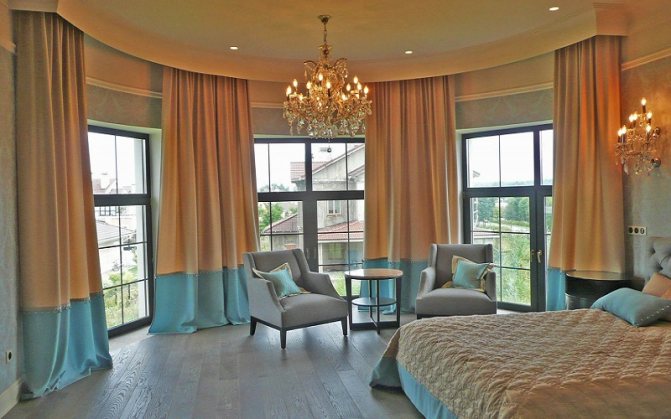 - Halferker. Mieux connu sous le nom de baie vitrée d'angle. Les rideaux vous permettent de corriger sa forme légèrement irrégulière et de souligner correctement une idée architecturale aussi exotique à l'intérieur.