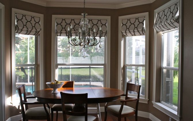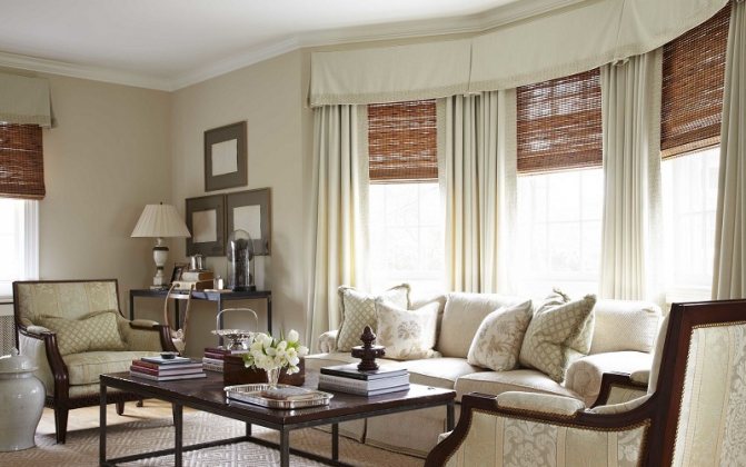 Des rideaux romains et français sont montés sur des corniches relevables. Un élément distinct est installé pour chaque toile. Selon la configuration de la baie vitrée, une corniche est réalisée pour une petite fenêtre en forme de rebord dans le mur.