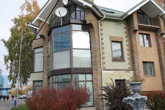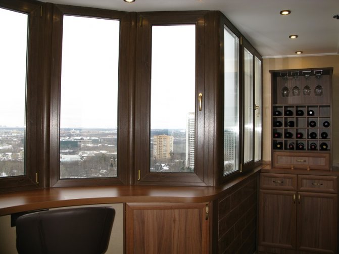 Les cadres de fenêtre sont assemblés à partir d'un profilé en plastique ou en bois. Les baies vitrées vous permettent de combiner des fenêtres à double vitrage à l'angle souhaité, dont la plage est de 90 à 180 degrés. Cela dépendra de la courbure de la façade et du nombre de châssis.