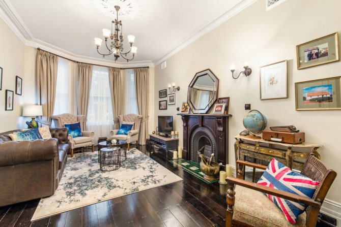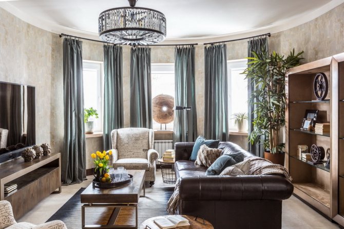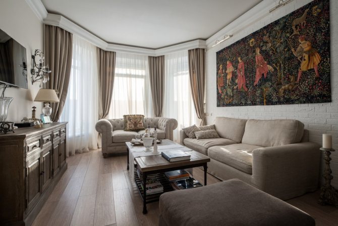 Sur la photo, il y a un salon dans le style des classiques modernes et des rideaux sur les baies vitrées.