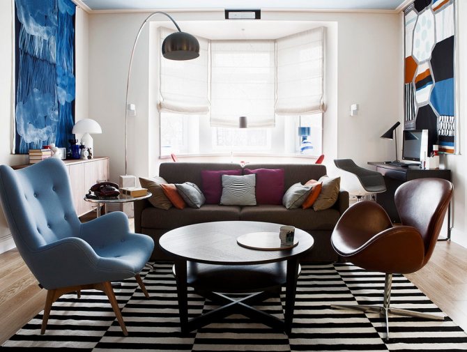 Les fenêtres avec une baie vitrée représentent une excellente occasion d'aménager un lieu de repos confortable à côté d'eux. Pour que vous puissiez vous retirer dans ce coin à tout moment de la journée, il est préférable de placer des rideaux courts, des stores ou des rideaux fonctionnels à l'intérieur de la niche de la baie vitrée. Les rideaux pleine grandeur remplissent une fonction purement décorative - ajoutant de l'élégance et adoucissant l'aspect général. Le style rétro est créé par le choix de tissus monochromes et d'imprimés rappelant les années 1960.