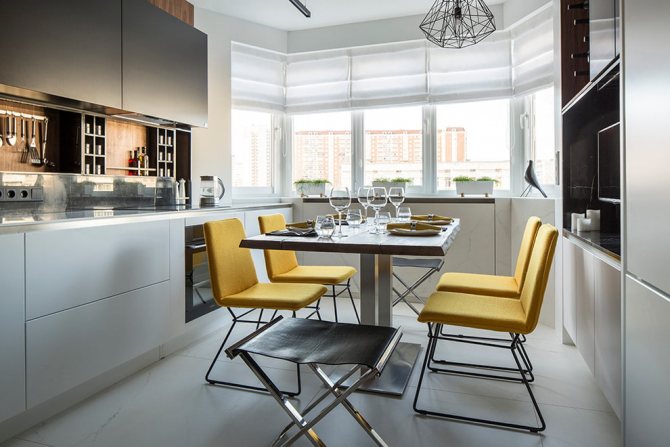 Les nuances de citron vives rafraîchissent extraordinairement l'intérieur de la cuisine dans un style moderne. Les fenêtres sont drapées de stores romains floraux pratiques et fonctionnels. La baie vitrée comprend une table à manger ovale entourée de chaises recouvertes de citron. Dans un tel intérieur, vous pouvez entendre le chant des oiseaux à l'extérieur de la fenêtre et porter l'arôme des pâtisseries faites maison - une atmosphère joyeuse élèvera sans aucun doute votre humeur le matin.