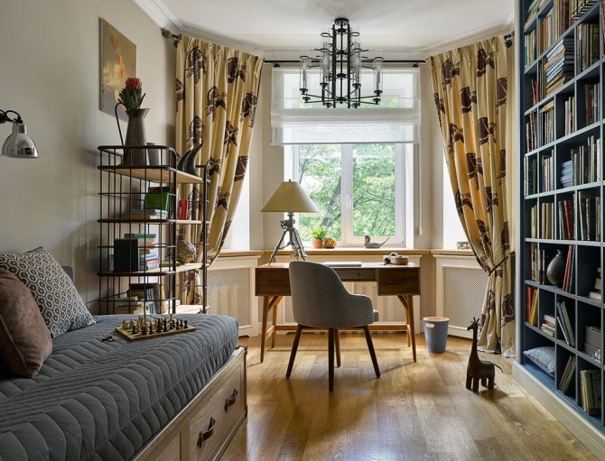 - Étude. L'organisation de cette option avec une bibliothèque vous permettra de travailler à domicile. Un large rebord de fenêtre apportera des avantages pratiques. Des étagères pour les documents et le matériel de bureau sont montées en dessous.