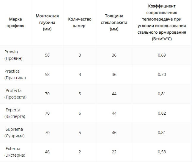 Pour que les structures de fenêtres remplissent leur fonction, leurs principaux paramètres de fonctionnement doivent être pris en compte dans un complexe. À l'aide d'un tableau dans lequel se trouve une comparaison des caractéristiques des profilés en PVC, le client a la possibilité de choisir rapidement la meilleure option parmi la série proposée. Avec un coefficient de transfert de chaleur égal, il est nécessaire de s'appuyer sur la plus grande épaisseur d'unités de verre utilisées dans l'assemblage des fenêtres. Plus les vitrages sont épais et plus le nombre de chambres est grand, mieux les structures des fenêtres retiennent la chaleur.