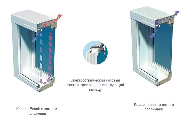 J'ai déjà dit que les fenêtres scandinaves sont privées de la capacité de ventiler la pièce en raison de l'impossibilité d'utiliser le mécanisme à charnière. Cependant, ils peuvent utiliser tous les systèmes connus utilisés dans les fenêtres européennes, y compris le système de «ventilation chaude». Dans ce cas, l'air extérieur, à travers un dispositif spécial situé dans la partie inférieure du cadre extérieur, pénètre dans l'espace entre les volets, se réchauffe et monte dans la pièce par la partie supérieure du cadre intérieur. Cela vous permet de ventiler la pièce et en même temps de ne pas la refroidir.