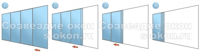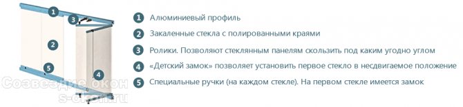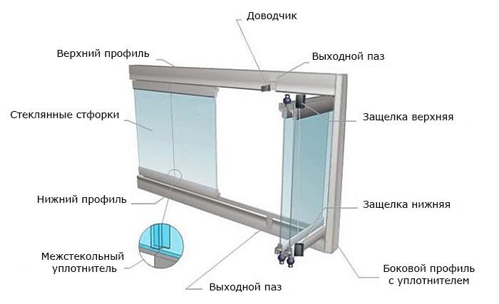 Les sections de verre sont en verre triplex ou trempé d'une épaisseur de 6 à 12 mm, qui, s'il est endommagé, forme des fragments sans arêtes vives, ce qui le rend sûr. L'ouvrant est relié aux guides au moyen de rouleaux, qui offrent la possibilité de faire coulisser les sections.