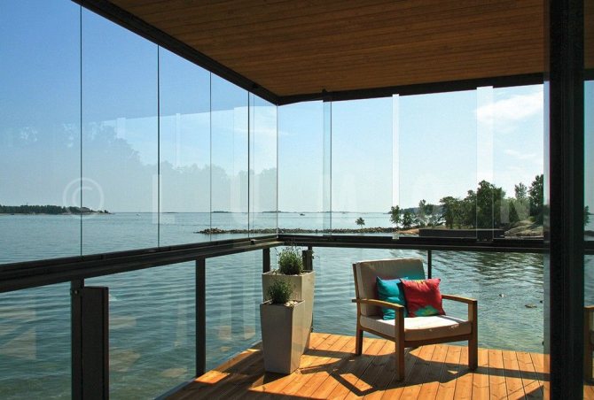 Si nous donnons une brève description, alors le balcon finlandais est un vitrage sans cadre et une grande surface. Pour les Finlandais, un balcon n'est pas un débarras ou un lieu de pause-fumée. Ceci est juste un autre espace de vie dans la maison, mais uniquement pour la période estivale. Une petite pièce aux murs transparents, où en été, vous pouvez installer une table avec des fauteuils et rassembler une petite famille moderne pour le thé. Et pour y ranger des choses ou aménager une buanderie pour un atelier, etc. cela ne leur vient jamais à l'esprit (pour cela, les complexes d'appartements ont des salles de stockage et des locaux au sous-sol).