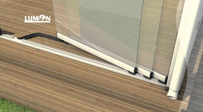 Le système lumon est l'un des pionniers dans l'introduction de la technologie finlandaise sur le marché intérieur. Ce système se compose d'un profil d'appui supérieur et d'un profil inférieur qui définit la trajectoire. Le verre trempé résistant au feu de 6 à 12 mm est fixé aux profilés en une seule ligne sans cadres (au sens habituel) et crémaillères. Entre les verres, il y a des entretoises en aluminium avec des roulements et des charnières pour un mouvement silencieux des fenêtres le long des rails.