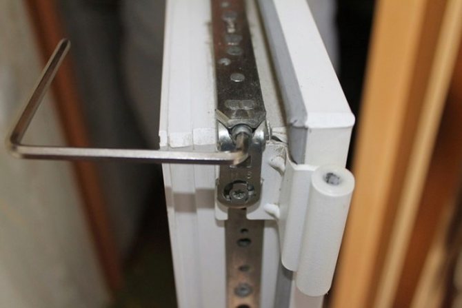 Lorsque la pression des ciseaux en haut de l'ouvrant est lâche, elle peut s'affaisser, vous devrez ajuster la vis dans les ciseaux près de la charnière supérieure. Trouvez-le et serrez avec une clé hexagonale. Comme d'habitude, se rapprocher du cadre permet à la clé de se déplacer dans le sens des aiguilles d'une montre.