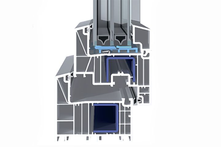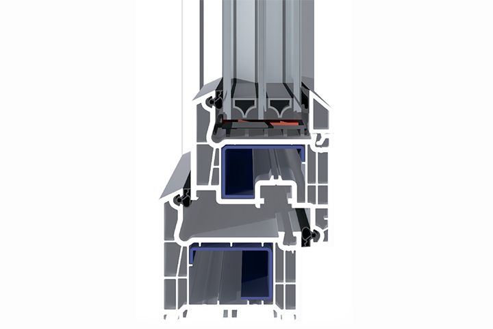 Le système BLUEVOLUTION 82 MD économe en énergie est conçu pour l'assemblage d'éléments de fenêtre. Ce profilé à six chambres a une profondeur d'installation de 82 mm, ce qui minimise le transfert de chaleur entre les parois et le cadre. Les fenêtres BLUEVOLUTION 82 MD disposent de 3 circuits d'étanchéité. L'un d'eux est situé à l'intérieur du puits de lumière et divise l'espace entre le châssis et le cadre en 2 chambres séparées. Grâce au troisième circuit, le niveau d'étanchéité des structures est passé à la classe 4 et une barrière supplémentaire a été créée pour protéger les raccords de l'eau. Ce système est également compatible avec un châssis sans circuit de joint central.