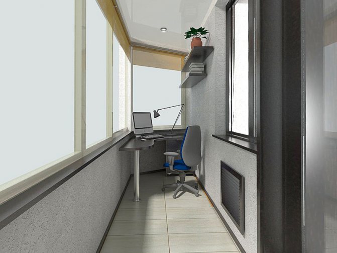 Un atelier ou un lieu de travail sur le balcon peut désormais être mis en place avec le "Bateau". Sa partie étroite peut être utilisée sous un bureau non standard en utilisant des appuis de fenêtre. Les meubles devront être fabriqués sur commande, la norme ne rentrera pas dans une petite largeur d'un petit coin.