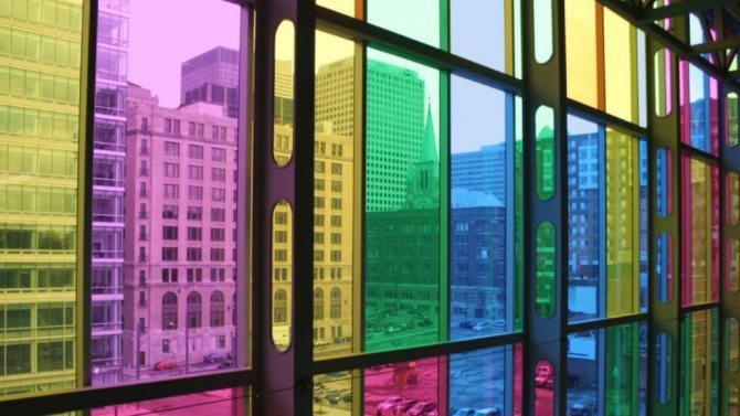 La teinture des fenêtres dans un appartement peut être réalisée avec un matériau mat. À l'aide de matières premières décoratives, vous pouvez donner aux surfaces en verre n'importe quelle texture, couleur, motif. De tels films aident à créer un intérieur inhabituel.