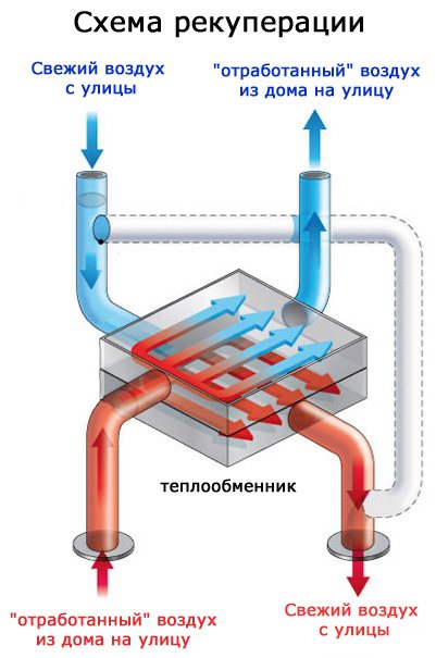 La plupart des bâtiments russes typiques ont une ventilation naturelle (ou gravitationnelle), ce qui est extrêmement inefficace et entraîne des pertes de chaleur importantes. En été, un tel système ne fonctionne pas du tout et en hiver, une ventilation constante est nécessaire pour le flux d'air frais. L'installation d'un récupérateur d'air permet d'utiliser de l'air déjà chauffé pour chauffer l'air entrant et vice versa. Le système de récupération est capable de fournir de 60 à 90% de la chaleur grâce au chauffage de l'air, c'est-à-dire qu'il vous permet d'abandonner les radiateurs à eau, les chaudières, les tuyaux.