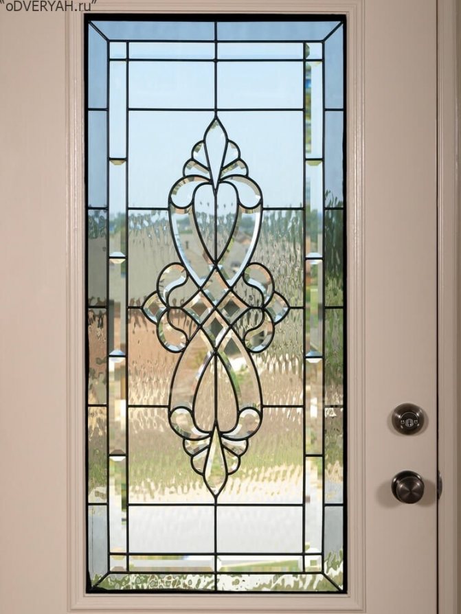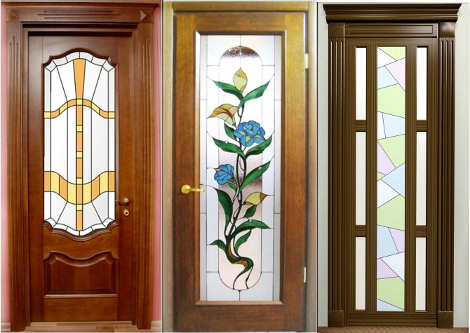 Le verre peut être décoré avec différents motifs à votre goût. Parfois, plusieurs inserts sont réalisés dans la porte intérieure. Ce travail doit être effectué en tenant compte des mêmes exigences que lors de l'installation de verre simple. Vous pouvez rendre la porte originale en installant un vitrail. Cependant, cette procédure nécessite de l'expérience.