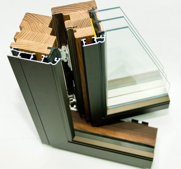 Si les fonds sont disponibles, des fenêtres en bois-aluminium peuvent également être fournies. Le cadre ici est en bois massif, recouvert de superpositions en aluminium. Une unité de verre standard y est insérée. Le bois permet d'éviter les «ponts froids» et le métal le protège des facteurs négatifs externes.
