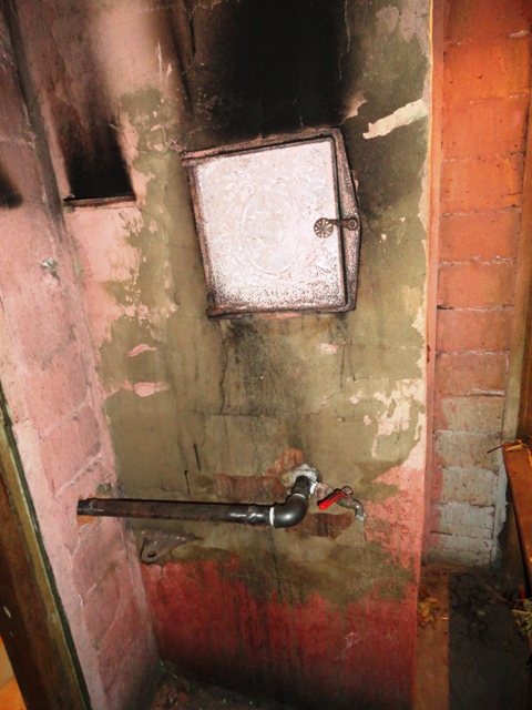 Au-dessus de la porte du four, vous pouvez voir la sortie du tuyau pour chauffer l'eau et à gauche du poêle se trouve un réservoir d'eau. A gauche de la porte du ventilateur, la vanne du conduit de ventilation est visible