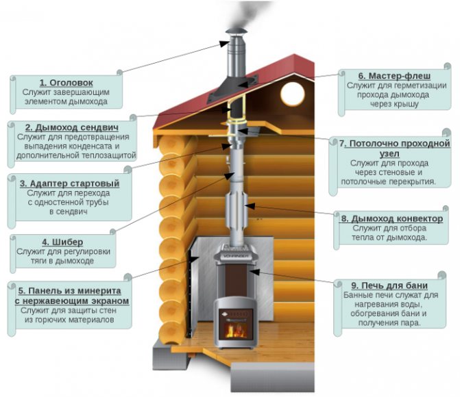 - Il est souhaitable que la cheminée du bain ait une hauteur totale de 4 à 5 mètres. Habituellement, il est placé plus près du mur de la pièce. Étant donné que la garniture en bois est très proche, vous devez prendre soin du protecteur d'écran.