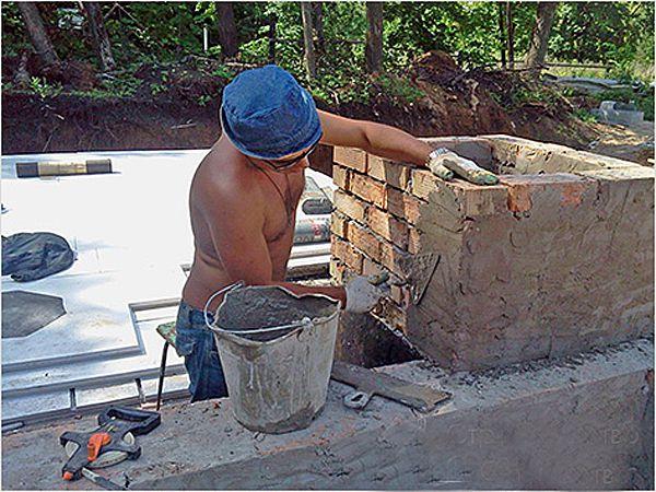 La maçonnerie de la cheminée doit avoir une épaisseur d'une demi-brique, ce qui est considéré comme la norme pour les bains. Dans le même temps, il est nécessaire de vérifier constamment la verticalité de chaque rangée, car à l'avenir, il sera impossible de corriger les erreurs sans retirer les briques. Cela peut être fait à l'aide d'un fil ordinaire tendu du coin de l'ouverture du plafond à l'angle de la partie aérienne formée par la première rangée.