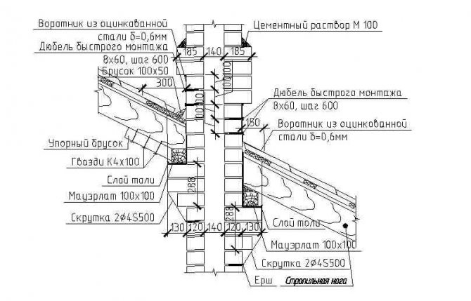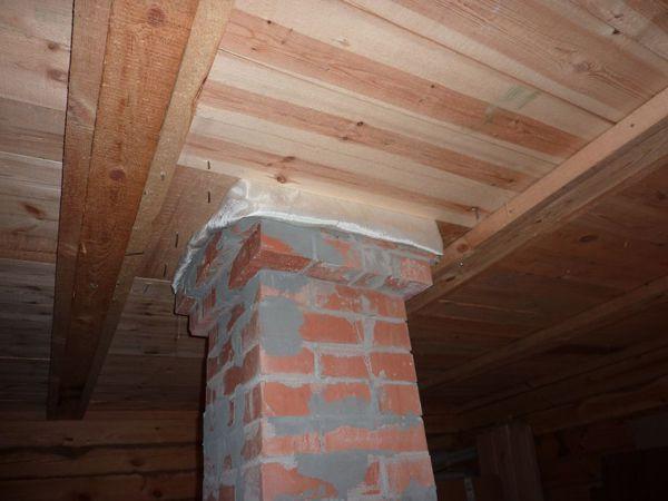 - Dans les endroits où une cheminée en brique traverse le plafond, des peluches sont effectuées - un épaississement du tuyau. L'épaisseur du duvet est de 1 à 1,5 briques.