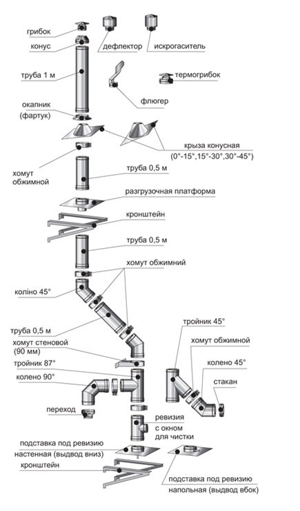Tous ces éléments de raccordement peuvent avoir des diamètres: 120, 150,200 mm et sont utilisés en fonction des caractéristiques de conception du dispositif de cheminée et d'autres facteurs. Le diamètre du tuyau intérieur correspond toujours à la taille du sandwich cheminée et de ses accessoires.