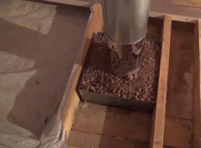 Au début, un boîtier est construit qui est un peu plus grand que le conduit de fumée lui-même. Il peut être rectangulaire ou circulaire, selon le matériau et le dispositif de cheminée, constitué de tuyaux en fer ou revêtu de briques. L'espace formé entre le tuyau et le tubage est rempli de sable, de sable d'argile expansé, d'un combat de briques et enfin, afin d'empêcher l'humidité de pénétrer au milieu, il est bouché avec un mortier de ciment.