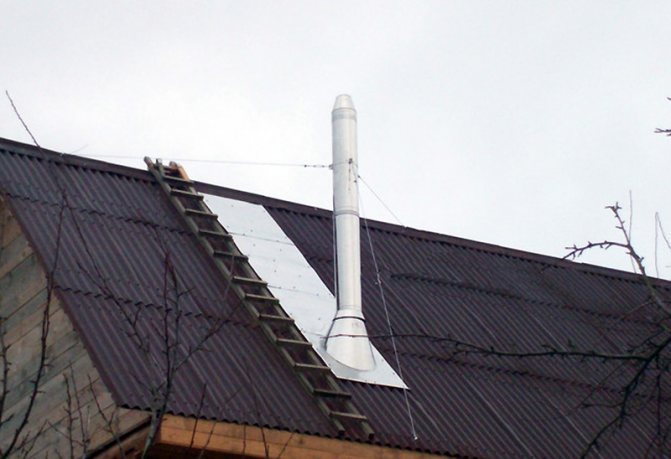 Après cela, vous devez inspecter soigneusement l'endroit où la cheminée sort par les plafonds et le toit. La sortie à travers le plafond doit être protégée par une boîte en acier. La distance minimale entre la cheminée et les parois du conduit est d'au moins 20 cm. En sortant par le toit, la cheminée ne doit pas entrer en contact avec les structures du toit. Pour cela, des entretoises appropriées ou une hotte spéciale doivent être fournies, qui sont montées à l'extérieur du bâtiment.