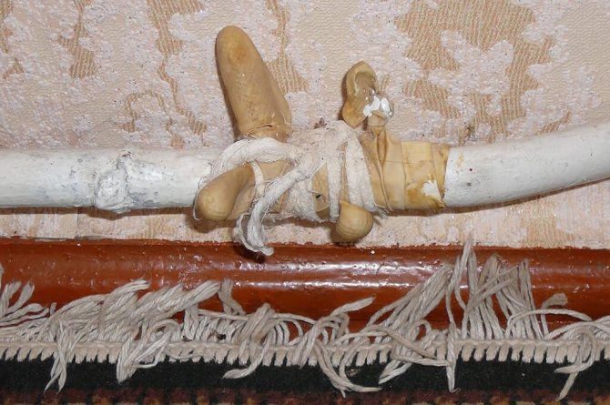 - Lorsque de l'eau goutte ou coule au raccordement du tuyau de chauffage, il s'agit d'une option plus compliquée, car il est possible qu'il existe différents diamètres des colonnes montantes. Dans ce cas, vous pouvez également utiliser le bandage d'usine, seulement vous devez remplacer la gomme d'étanchéité par un morceau de caoutchouc souple. L'essentiel est de l'enrouler correctement sur le tuyau, ainsi que sur les raccords, afin de lisser la différence de diamètre. Après cela, appliquez une pince.